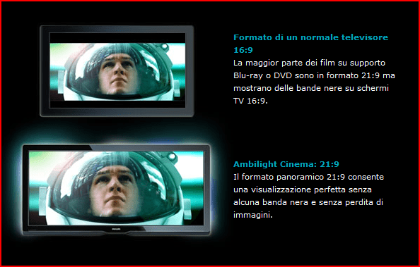 Prima il tradizionale 4:3, poi venne il 16:9, adesso è la volta del 21:9. Sto parlando di televisori. Il primo modello di tv con questo nuovo formato lo ha introdotto nel mercato la Philips, chiamandolo “Ambilight Cinema”. M0è arrivata una newsletter di presentazione del nuovo prodotto proprio qualche giorno fa. Dicono che questo è il formato perfetto del cinema (ma qualche hanno fa non dicevano la stessa cosa del 16:9?), dicono che non si perde alcuna porzione dell’immagine, che si evita la visualizzazione delle famigerate bande nere e bla, bla, bla…